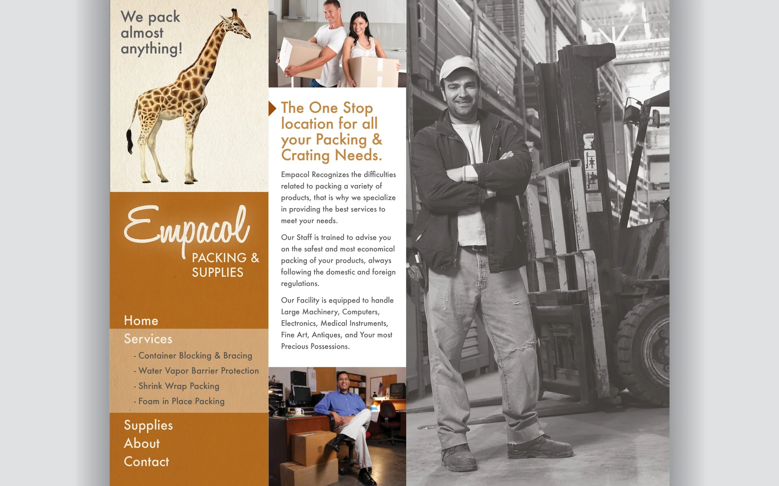 A packing and shipping company in Florida. They once shipped a giraffe. Brooks Design Group asked me to explore logo and web design for the company. Playing off the giraffe story and their current logo, a new image was developed focusing on stencils, box stamps and packing tape.